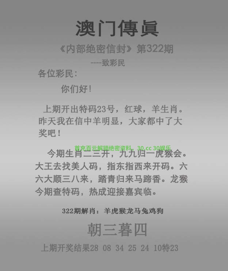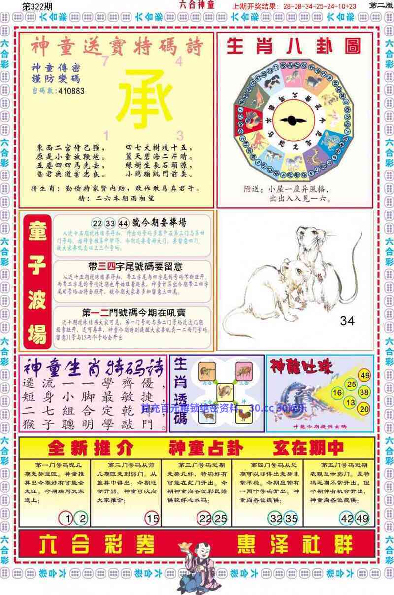 传真322期 今期生肖二三开,九九归一虎猴会 大王去找美人码,指东指西来开码 六六大顺三八来,踏青归来马蹄香 龙猴今期查特码,热成迎接嘉宾临 朝三暮四 同室操戈解:今期生肖二三开,九九归一虎猴会。二三解羊,九解鸡,一解蛇,明肖虎猴。大王去找美人码,指东指西来开码。美人解蛇羊鸡兔,六六大顺三八来,踏青归来马蹄香。三八解龙,明肖马,龙猴今期查特码,热成迎接嘉宾临。明肖龙猴 拐特生肖:羊蛇虎猴鸡兔龙马猪 |