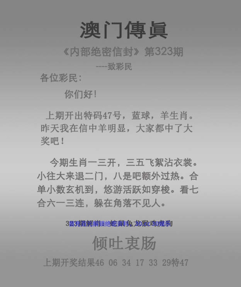 传真323期 今期生肖一三开,三五飞絮沾衣裳 小往大来退二门,八是吧额外过热 合单小数玄机到,悠游活跃如穿梭 看七合六一三连,躲在角落不见人 倾吐衷肠 同室操戈解:今期生肖一三开,三五飞絮沾衣裳。一三解蛇,三五解羊,小往大来退二门,八是吧额外过热。二门解一头,八解狗。合单小数玄机到,悠游活跃如穿梭。合单小数,看七合六一三连,躲在角落不见人。一三解蛇 拐特生肖:蛇羊狗马龙鸡猪兔猴 |