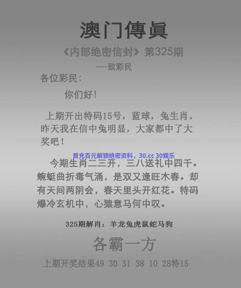 传真321期 今期生肖四三开,三下五上蓝波旺 火土特肖有你看,百花争艳春常在 生肖头尾出真码,一出头地定当强 蛇马相见恨见晚,有八有六要发财 真命天子 同室操戈解:今期生肖四三开,三下五上蓝波旺。四三解猪,三下解龙,五上解鼠,蓝波。火土特肖有你看,百花争艳春常在。火肖蛇马,土肖牛羊龙狗。生肖头尾出真码,一出头地定当强。一头数,蛇马相见恨见晚,有八有六要发财。明肖蛇马,八解狗,六解鼠 拐特生肖:猪龙鼠蛇马牛羊狗兔 |